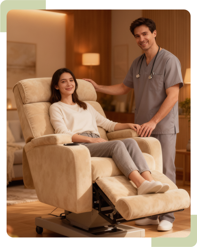 Nossa poltrona elétrica reclinável oferece segurança, praticidade e conforto para o período pós-operatório, com controle remoto de inclinação e apoio ergonômico que facilitam o dia a dia de quem precisa de mobilidade.
